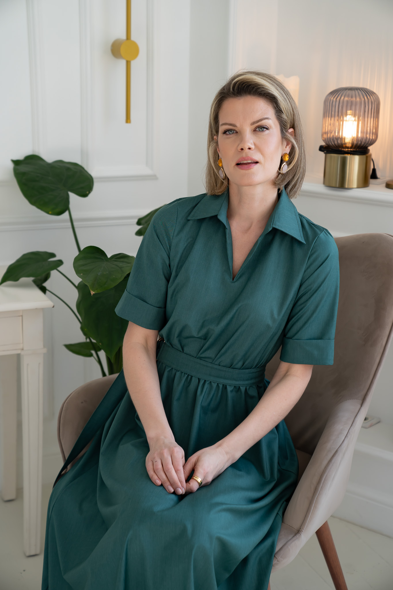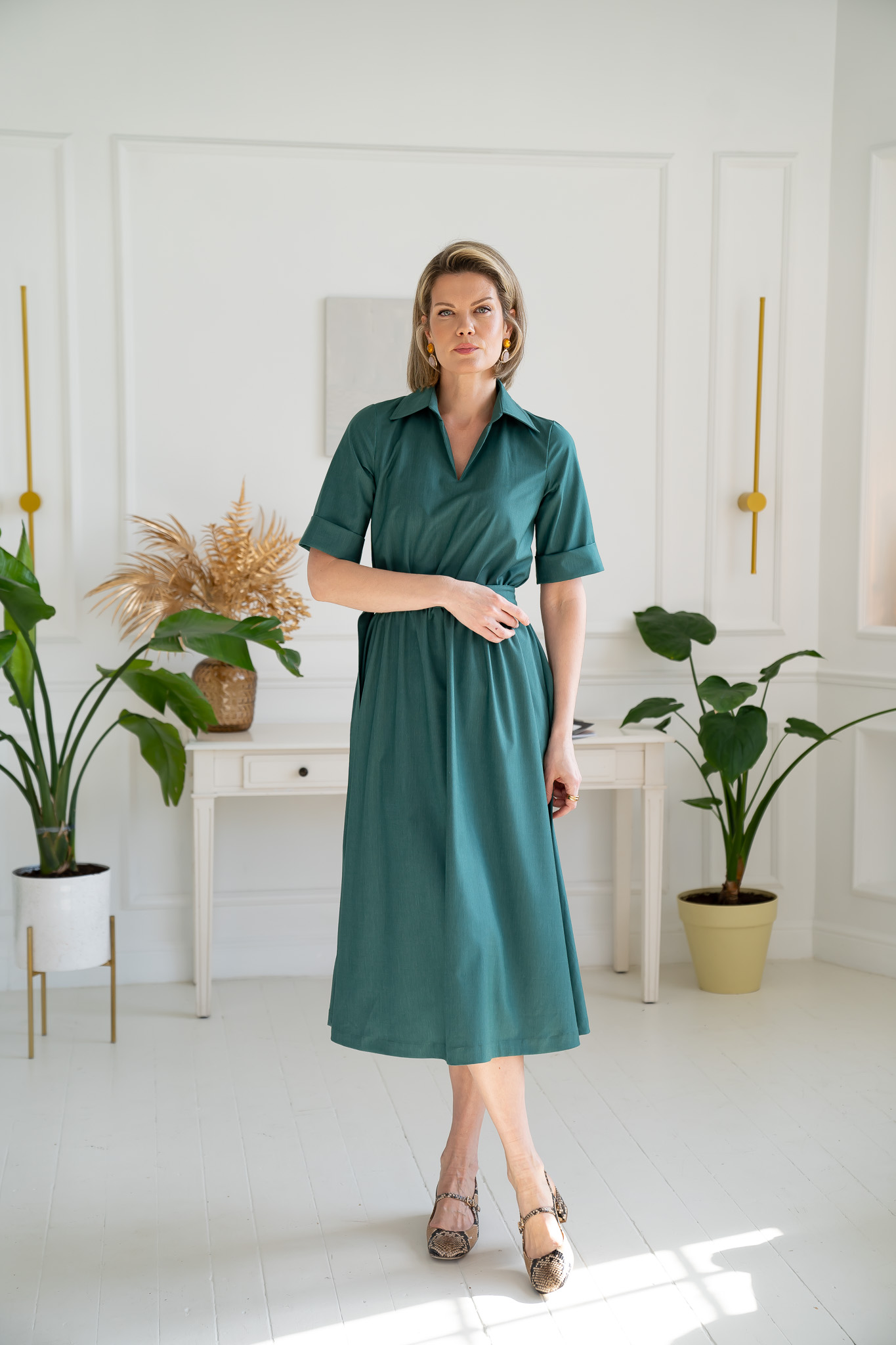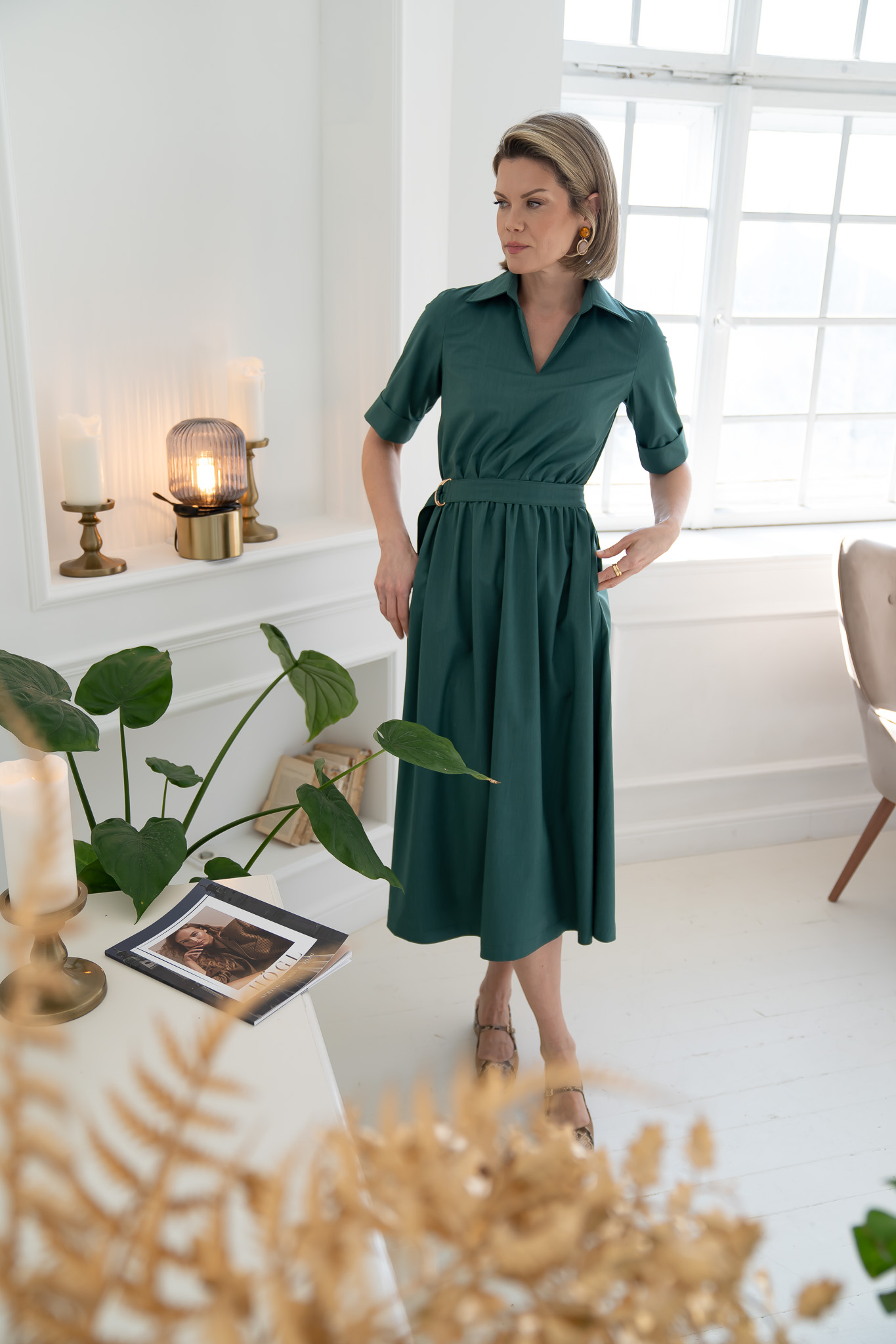 A classic, yet feminine and elegant dress in a rich green shade. Crafted from medium-weight cotton and viscose, it is both vibrant and refined. The half-length sleeves feature decorative cuffs, while the accentuated waist and full skirt create a distinctly feminine silhouette. Practical side pockets provide comfort without compromising sophistication. A perfect choice for both everyday wear and special occasions – a versatile dress that blends classic style with modern elegance.