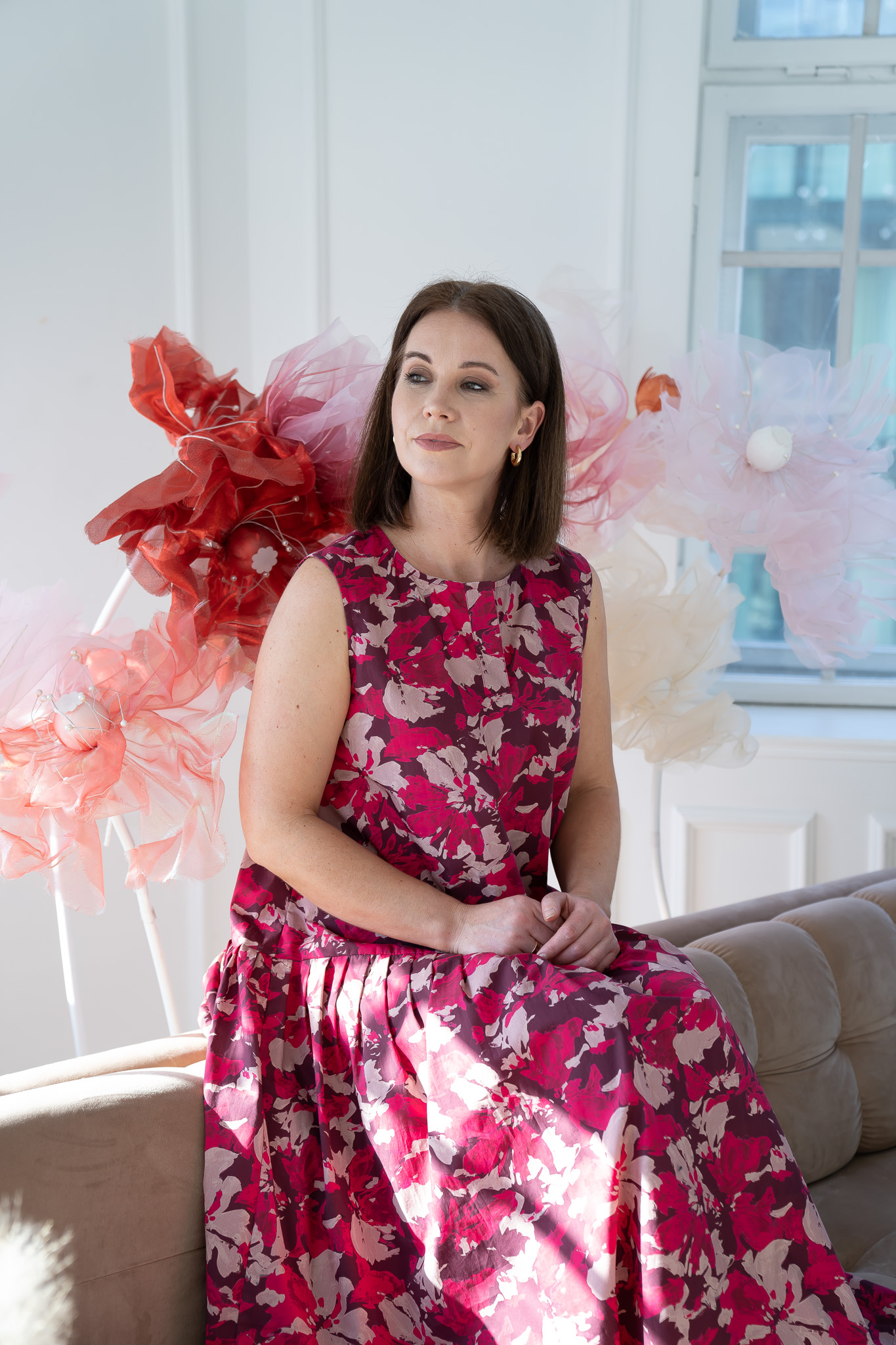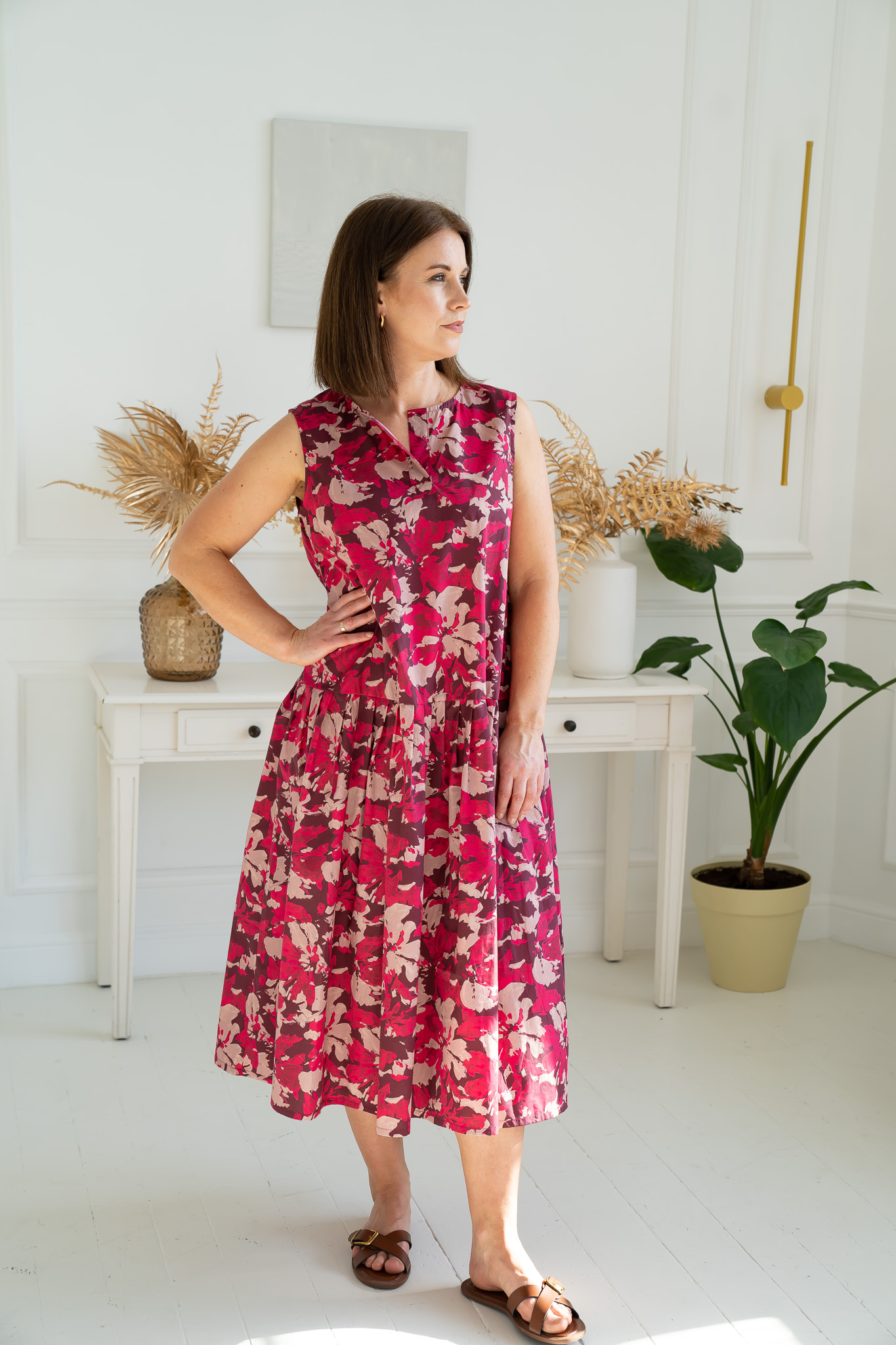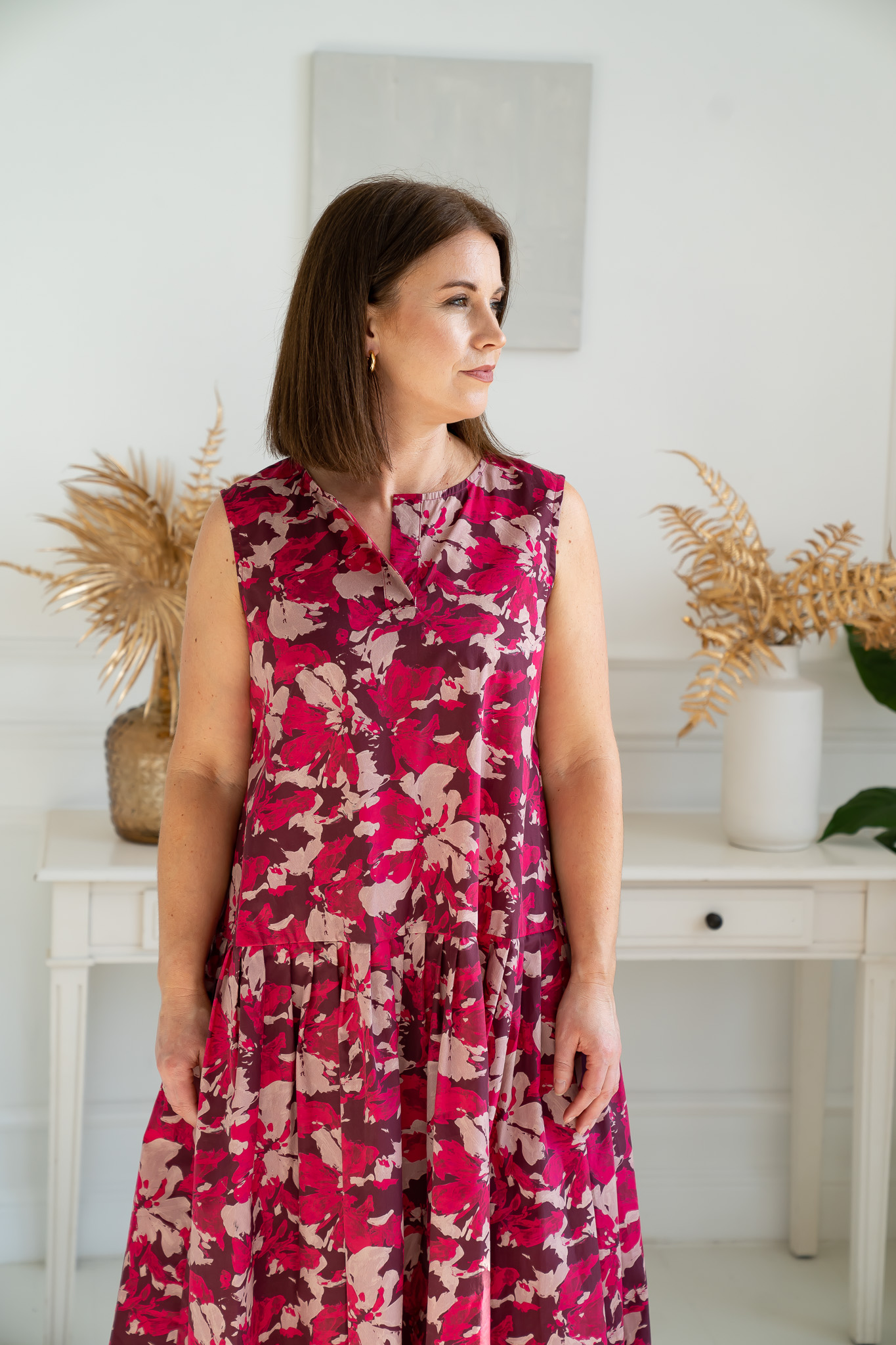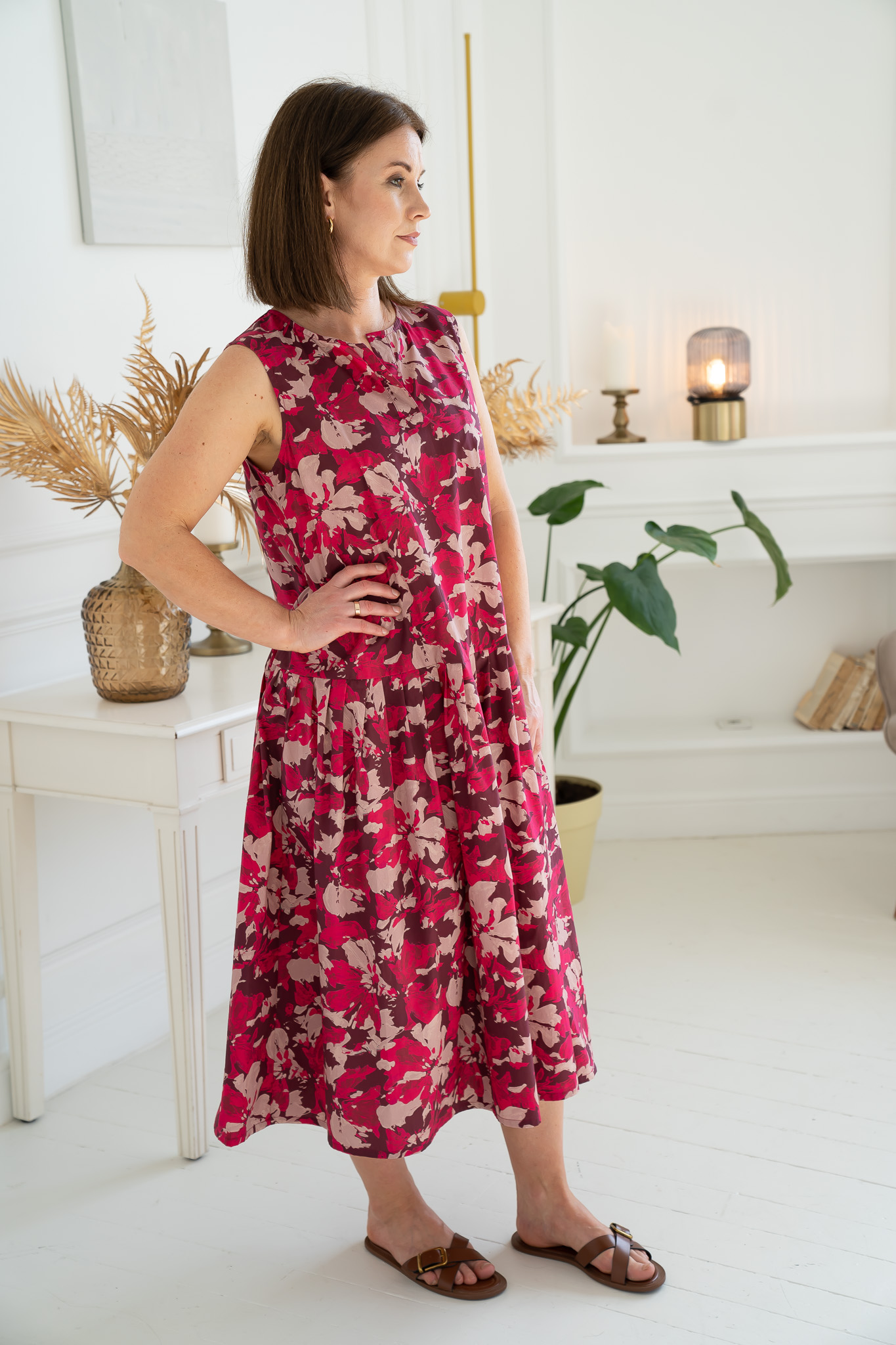 Description: Lightweight cotton (100%), distinctly relaxed fit, decorative V-neckline, side pockets, ruffle detail, midi length.