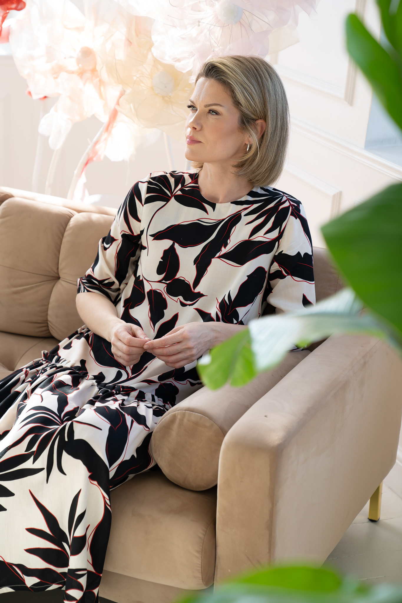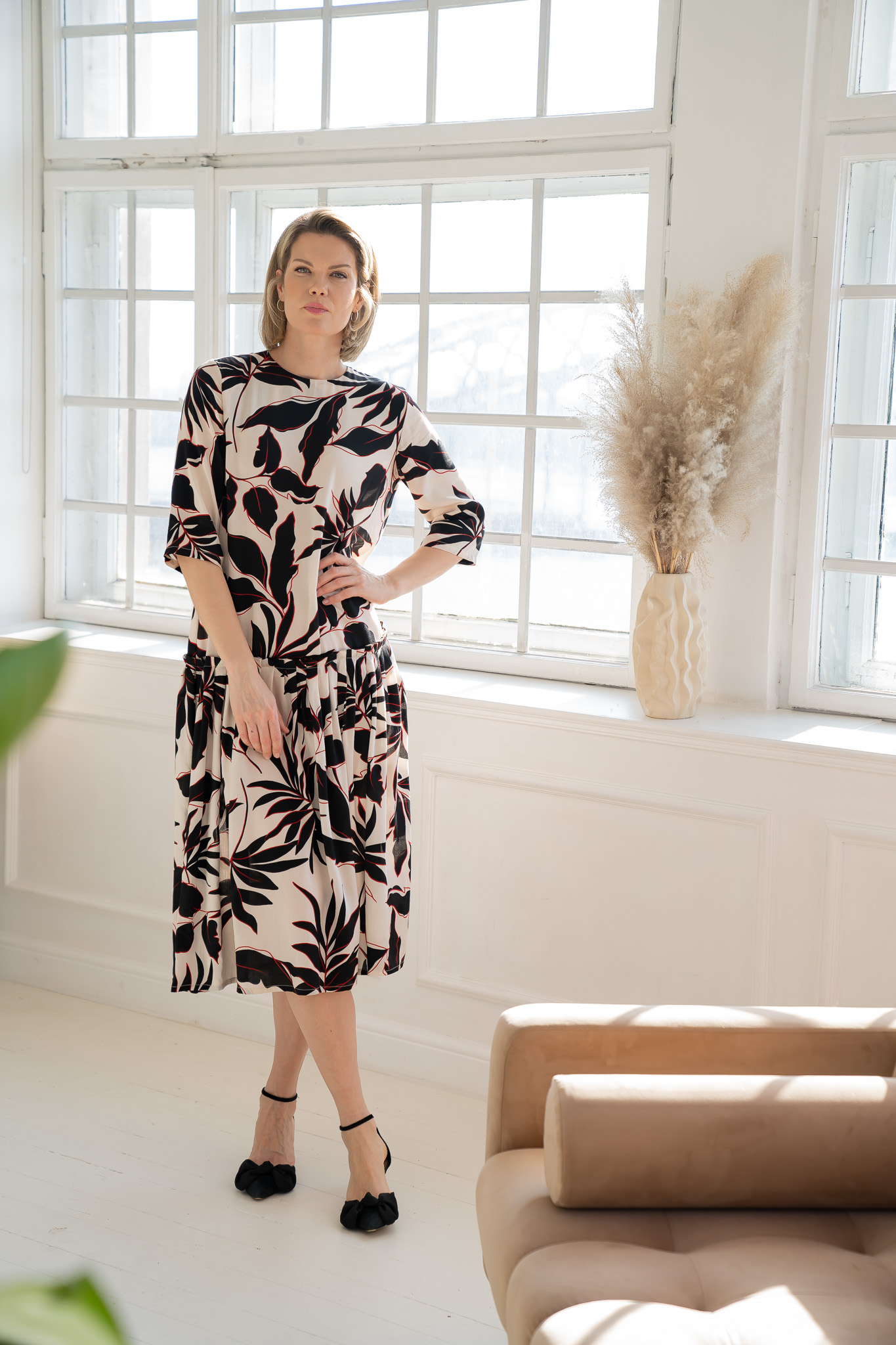 A soft and light viscose dress with half-length sleeves. The top of the dress is loose-fitting, with slightly dropped shoulders. The voluminous ruffle is designed to additionally emphasize its seam. The midi length will allow the dress to be worn with low and high shoes.