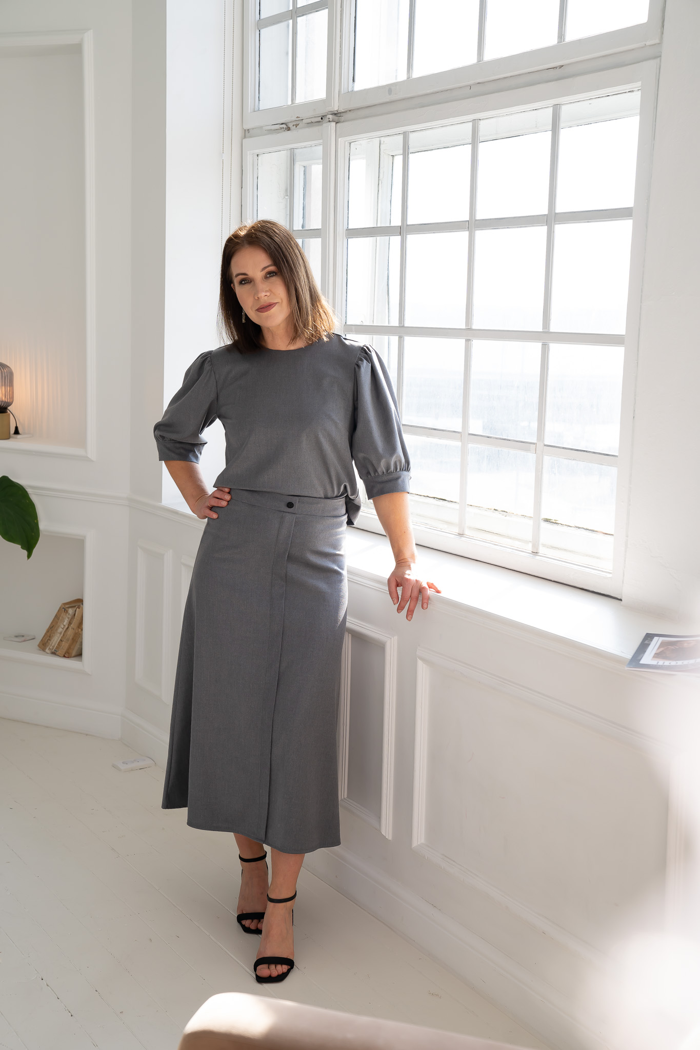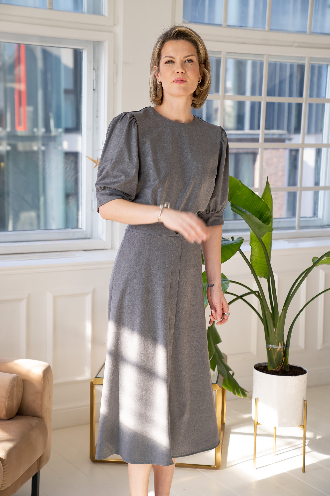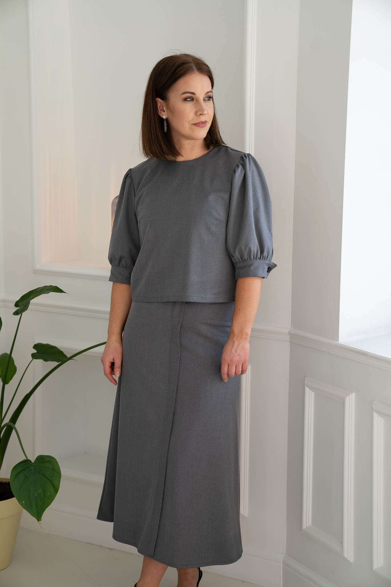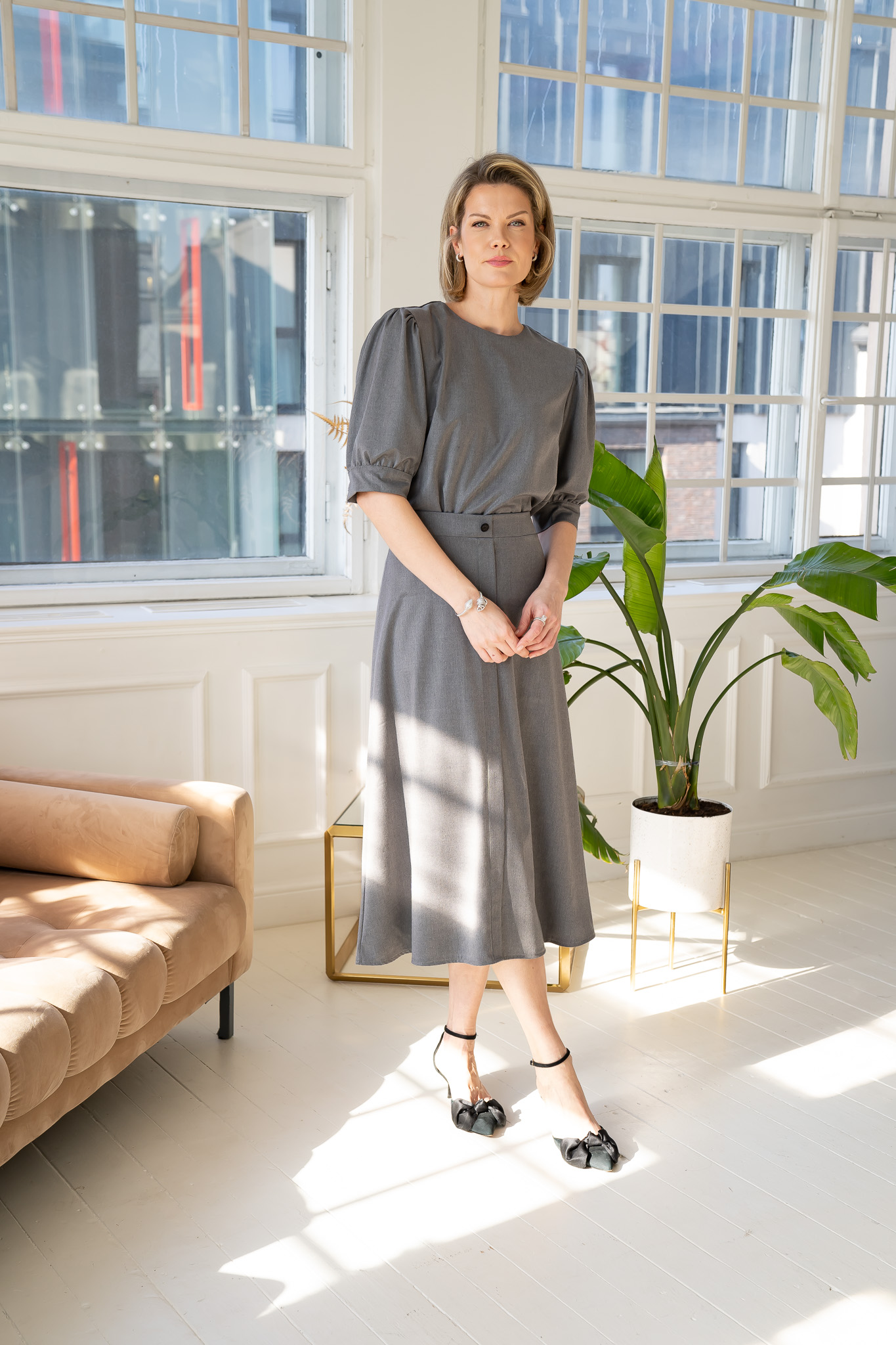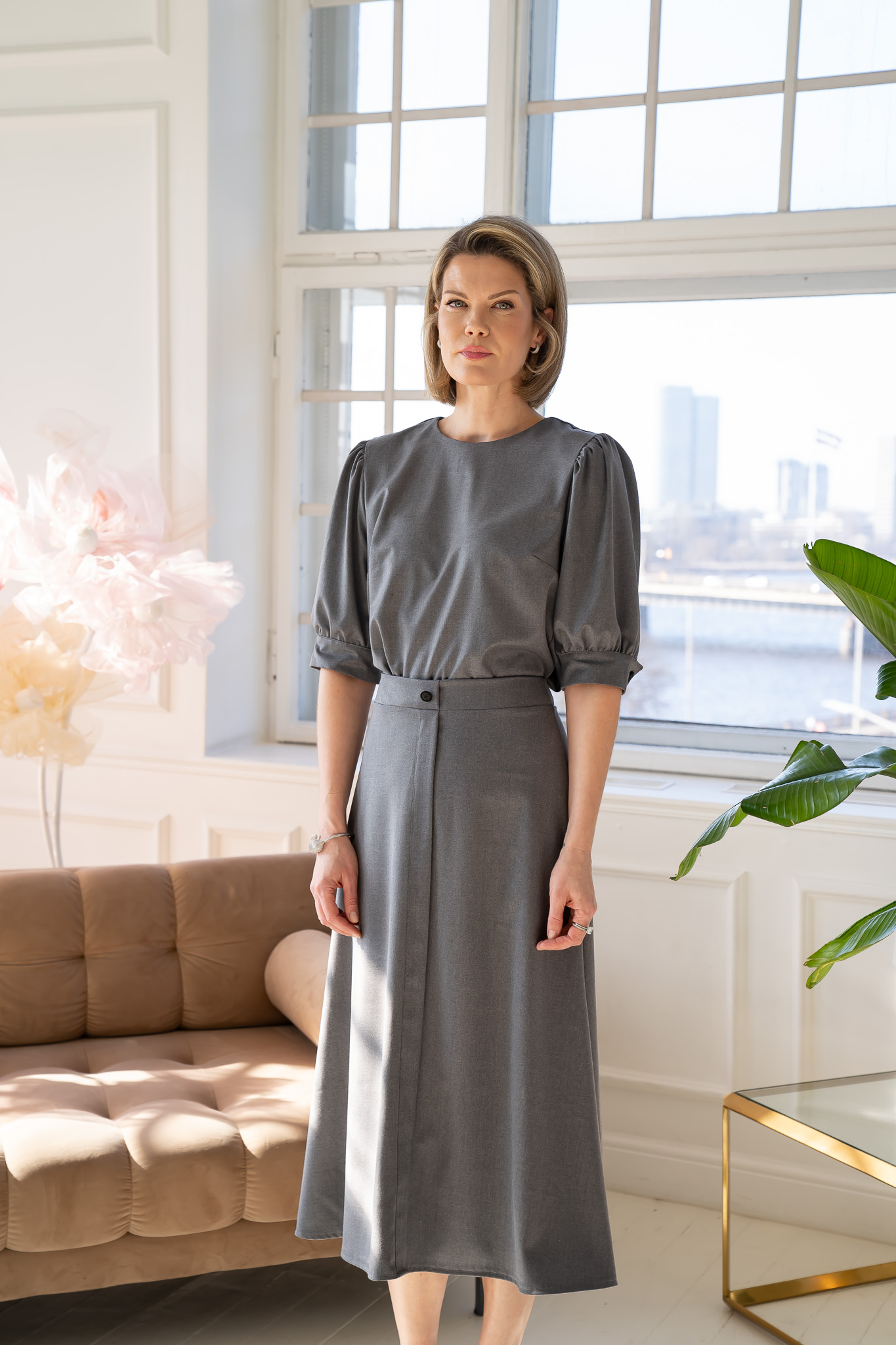 Description: Medium-weight fabric (70% viscose, 20% wool, 10% silk), A-line trapeze shape, zipper closure at the back, elevated waistband, midi length.