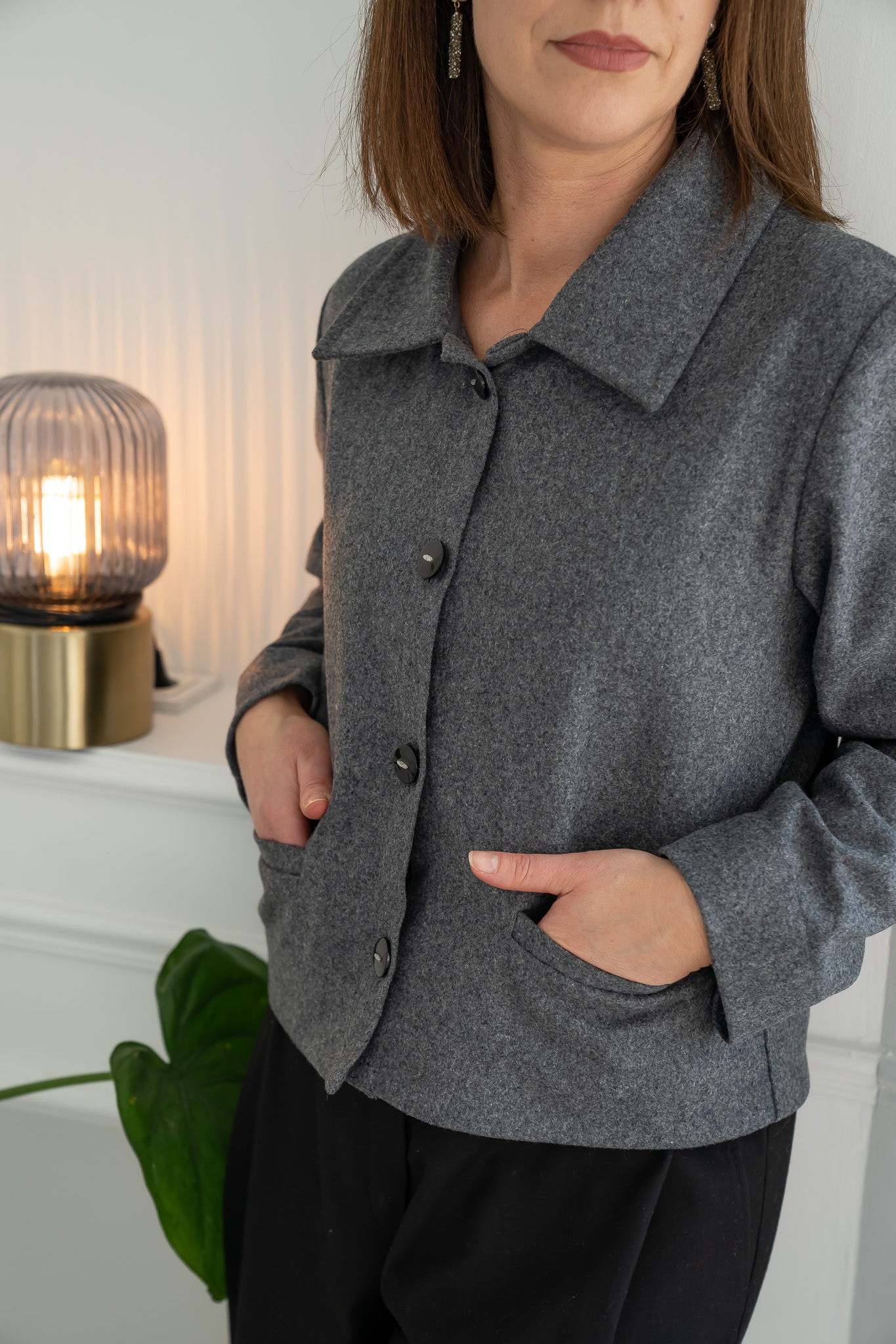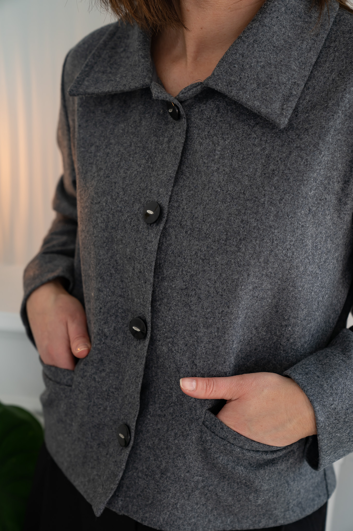 Classic wool jacket with a smooth, lightweight silhouette, featuring decorative front pockets and buttons. Made from light wool, this jacket is comfortable to wear even indoors. Its versatile design makes it a perfect addition to any wardrobe.