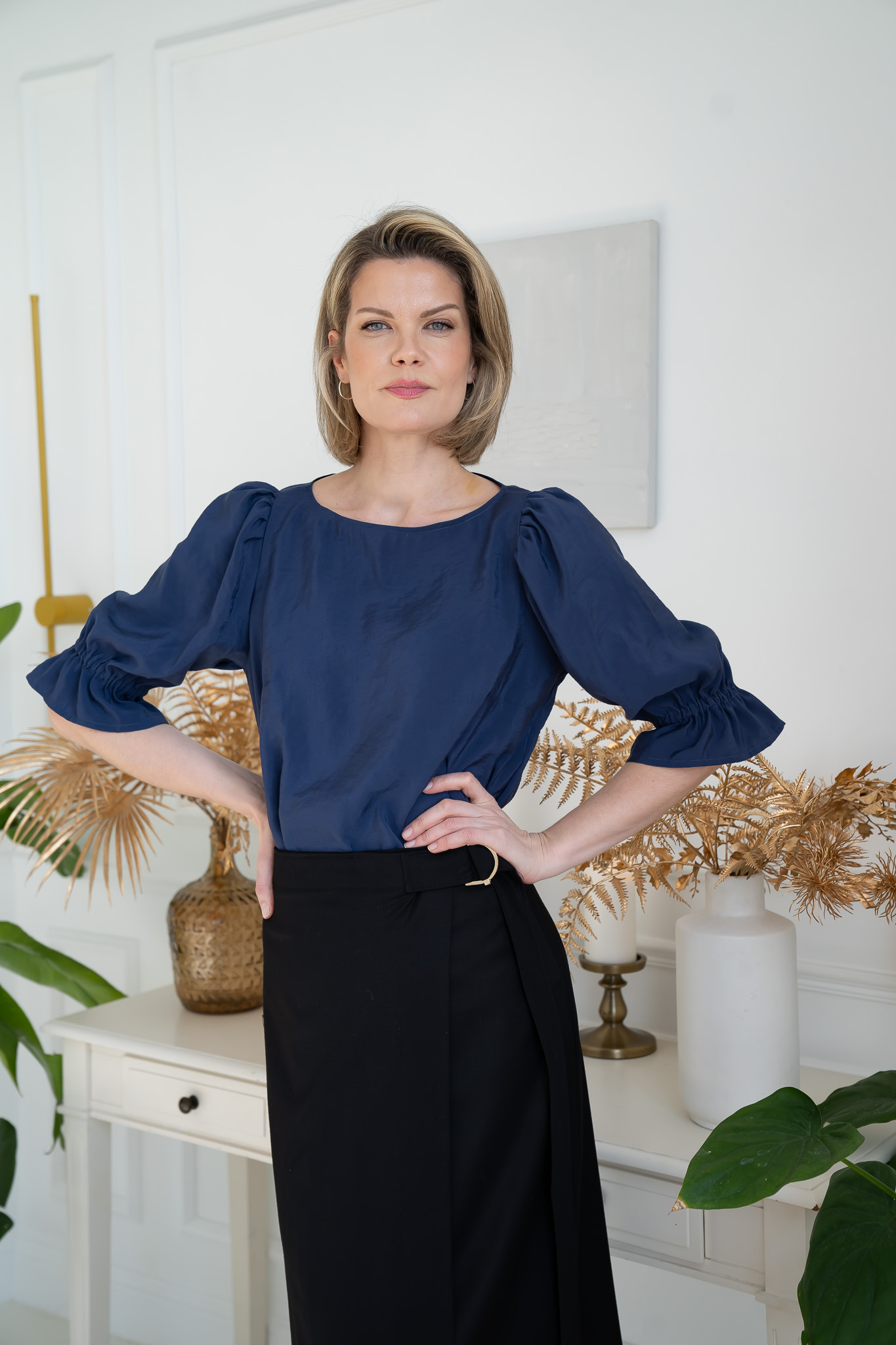 Description: crafted from soft, lightweight 100% viscose. Features mid-length sleeves with delicate elastic gathering at the cuffs.