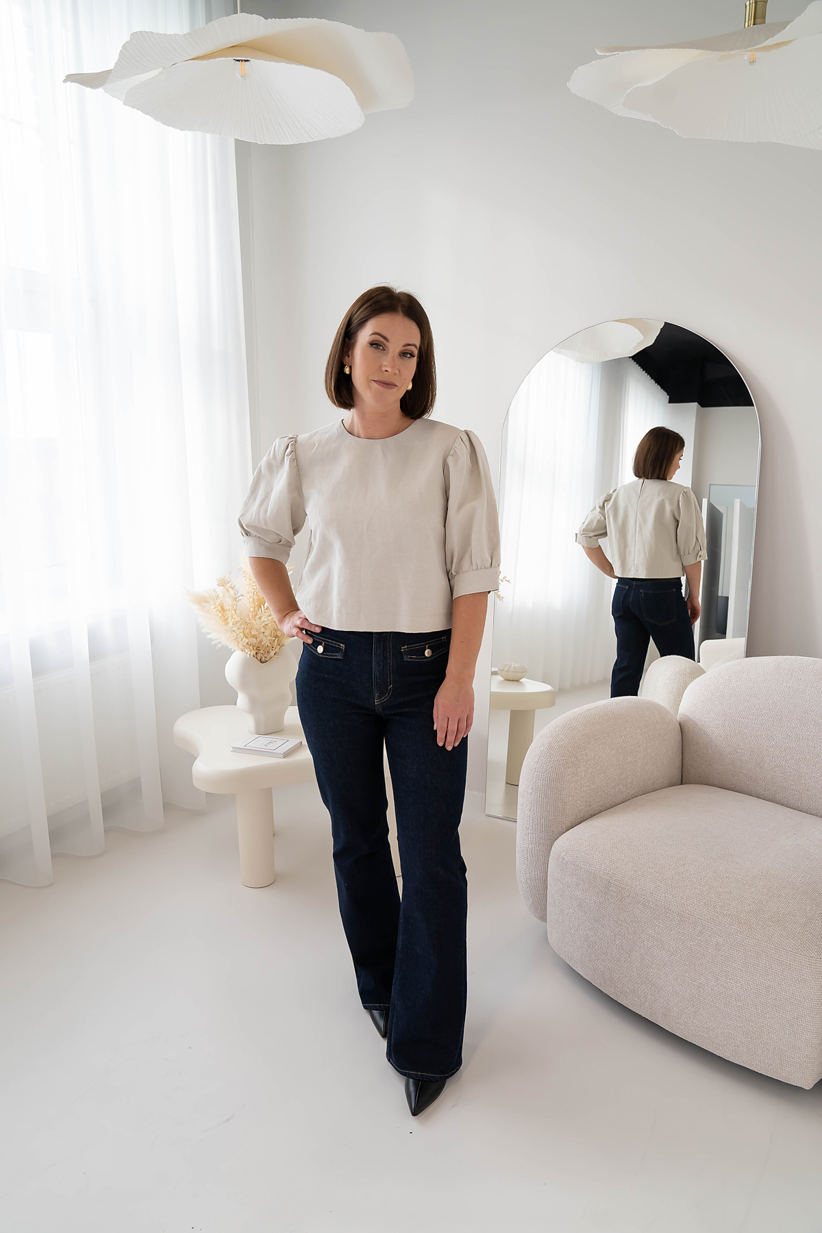 Charming linen top with wide sleeves from the TOVE linen set. Made from a relatively dense linen fabric, which gives more shape to the voluminous sleeves. The linen top is slightly shortened in length, so it is convenient to combine it with both the Tove linen skirt and any style of trousers (for example, the palazzo style MAASA trousers), as well as skirts of different styles. The calm beige tone will allow for endless variations of clothing combinations.