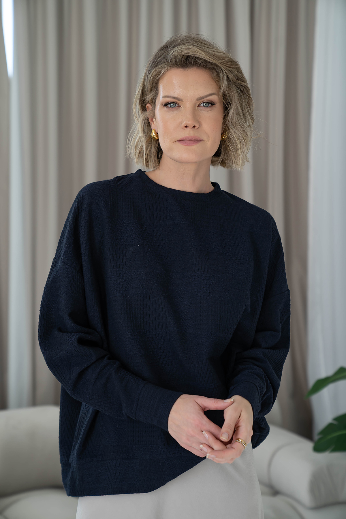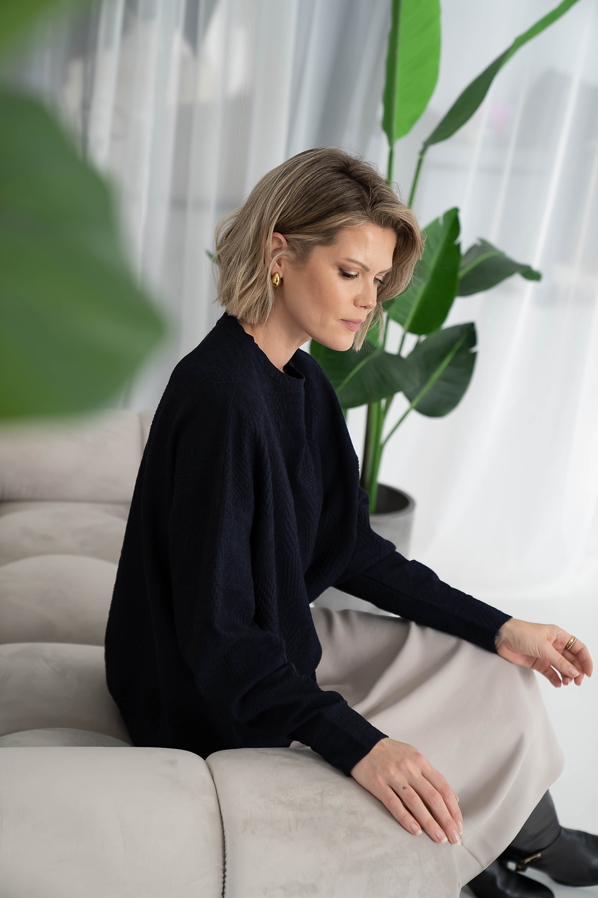 Izteikti brīva piegriezuma džemperis no vidēji blīvuma materiāla ar burvīgu ģeometrisku raksta faktūru, tumši zilā tonī. Džemperis būs ideāli kombinējams gan ar midi garuma svārkiem, gan džinsu, gan arī ar klasiskām biksēm, pat ar šortiem. Izvēle paliek Tavā ziņā! Ieskaties MAASA piedāvājumā, kur atradīsi gan bikses, gan svārkus ar kuriem izdosies ideāls salikums!