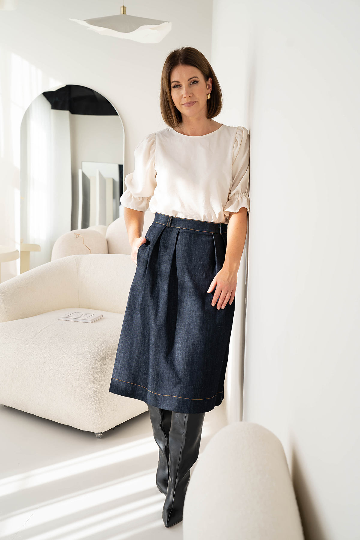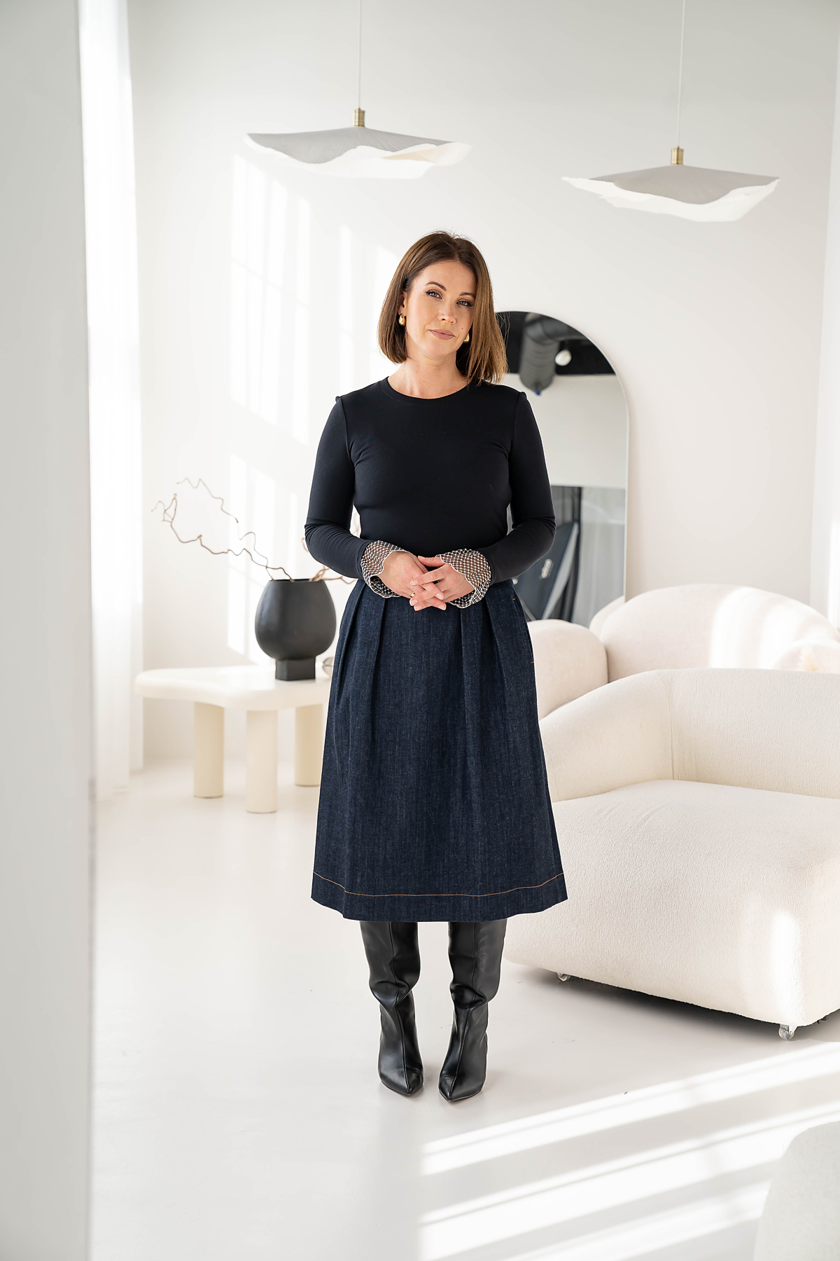 Svārki, kas tik burvīgi iekļausies jebkurā garderobē. Vienkāršais un lakoniskais A silueta piegriezums akcentēs vidukli. Nelielās ieloces džinsu svārku priekšpusē un mugurpusē piešķir svārkiem vieglumu. Denim apģērbiem raksturīgās nošuves kontrastējošā tonī, piešķir tiem individualiāti un raksturu. Papildus akcents mugurpusē- metālisks rāvējslēdzis. Denim svārkiem kabatas ir neatņemama sastāvdaļa.