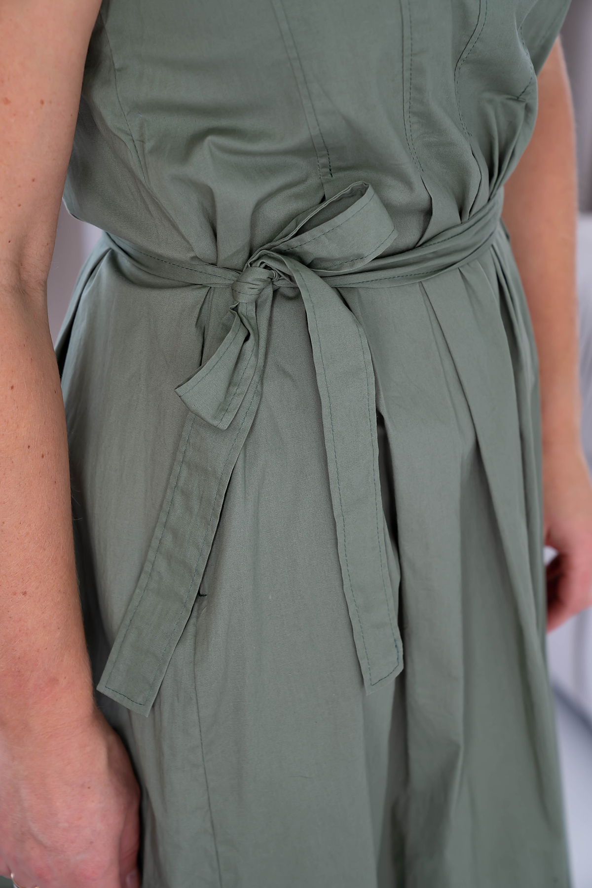 Apraksts: Kleita ar pārlocēm, mugurpusē aizdare ar rāvējslēdzēju, bez piedurknēm, ir kabatas, pievienota josta, 100% kokvilna.