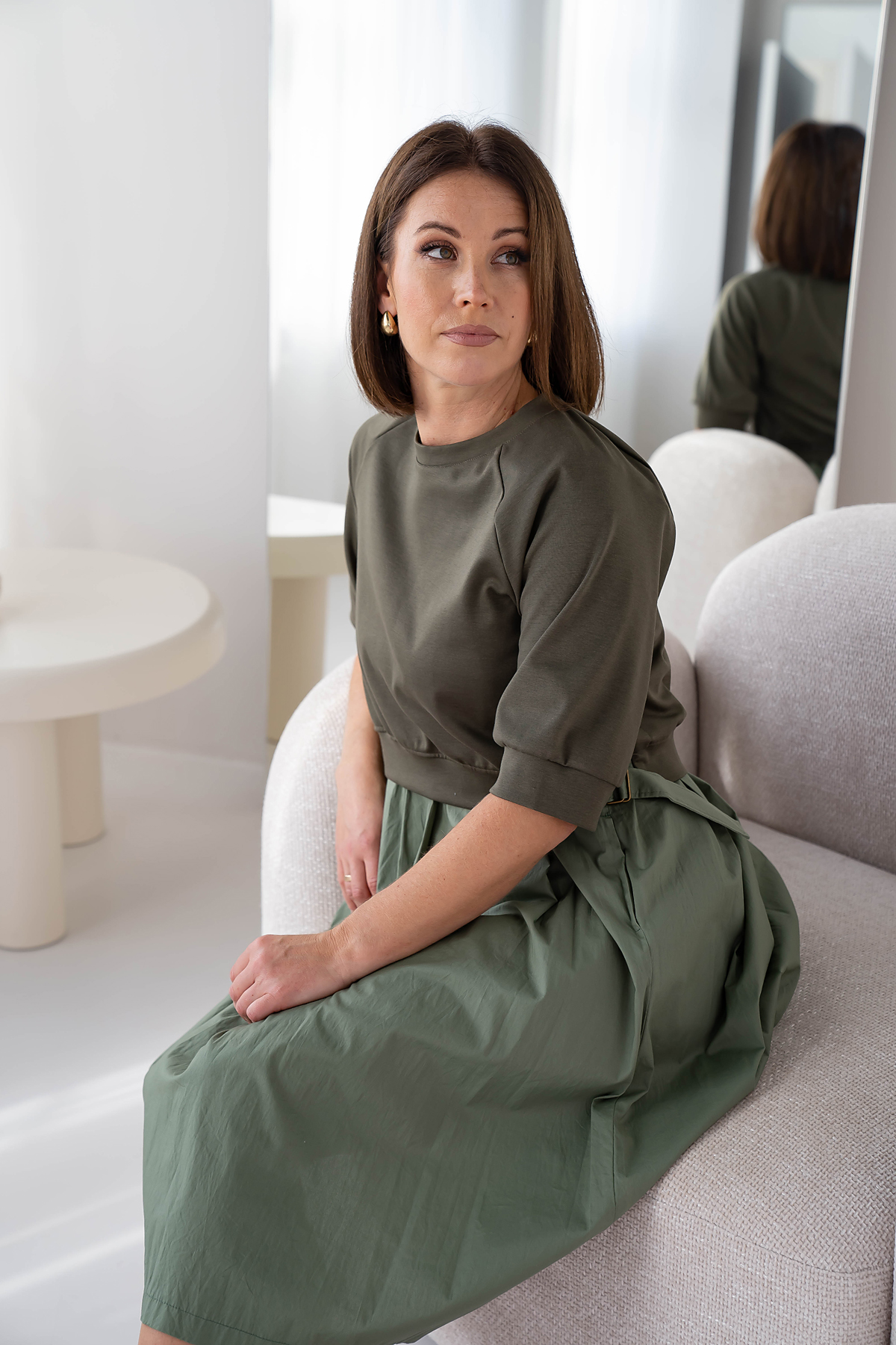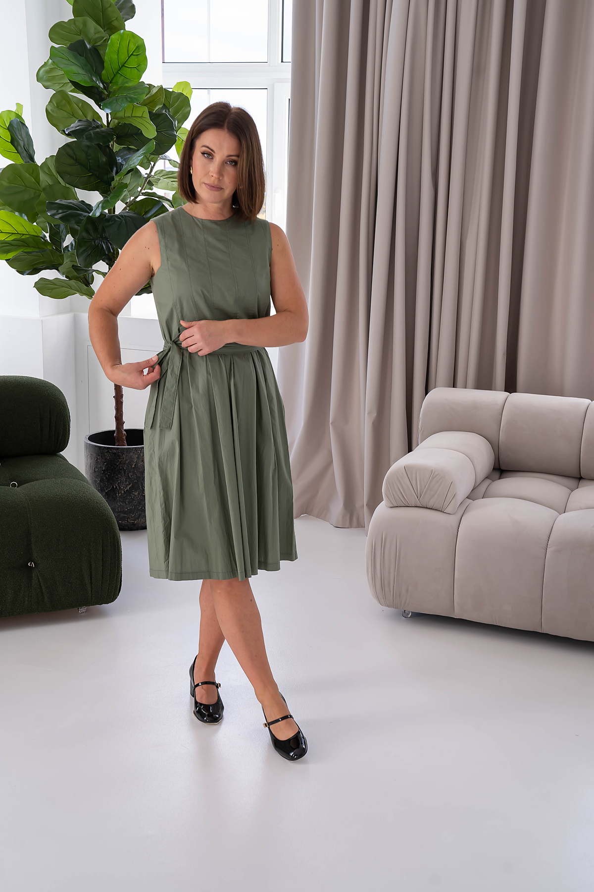 Detaļām ir nozīme. Kleita radīta no maigas kokvilnas. Dekoratīvās ieloces un nošuves detaļas izceļ kleitas eleganci, savukārt kuplā svārku daļa rada vieglu un sievišķīgu siluetu. Papildus ir pievienota kokvilnas josta, ja vēlies akcentēt vidukli. Kleitai sānos ir iestrādātas kabatas. Piedāvājumā ir saīsināta garuma džemperis ar metāliskām sprādzēm, kas lieliski papildinās šo kleitu.