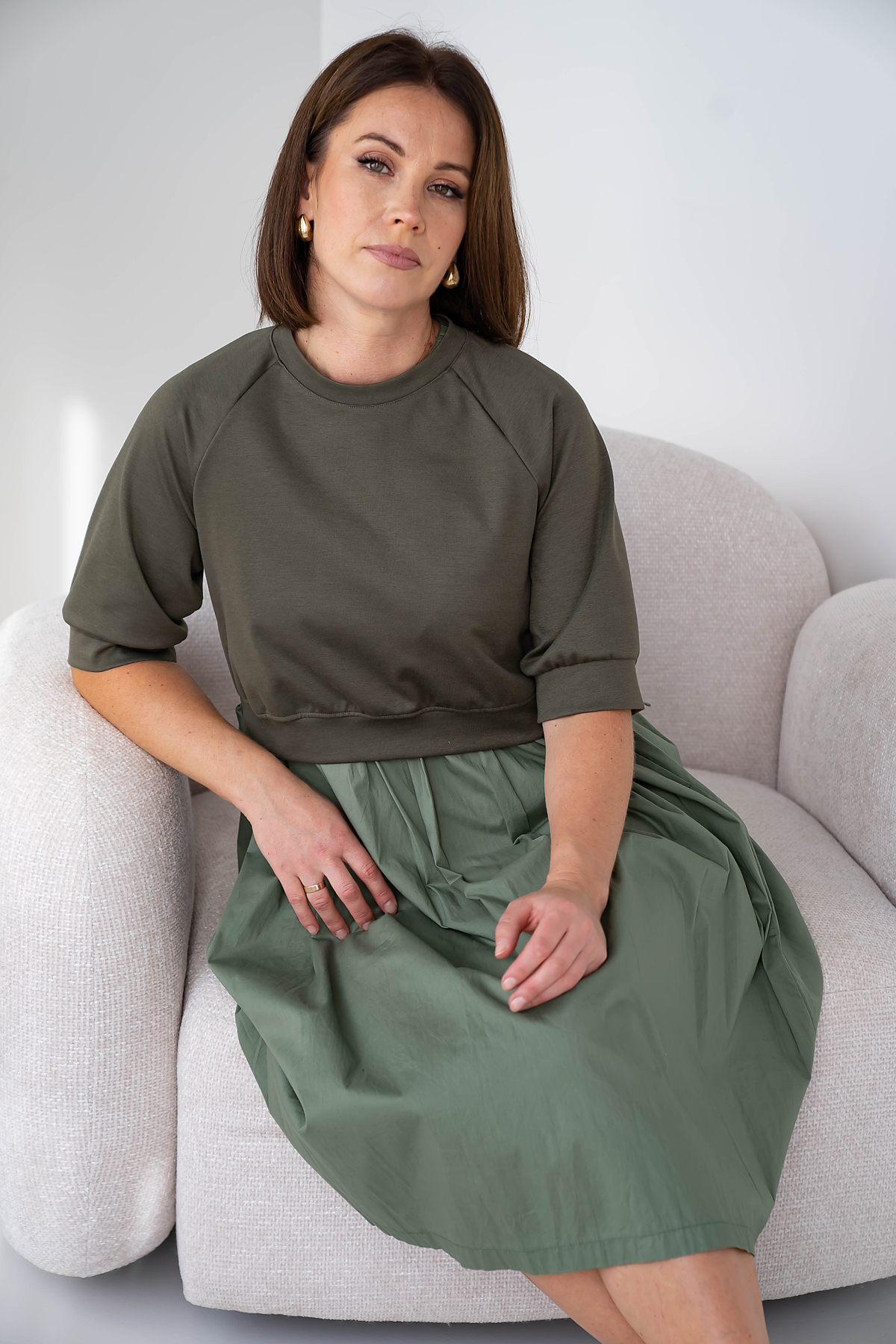 Detaļām ir nozīme.Divi vienā! Kleita un džemperis. Kombinē pēc vēlmēm un noskaņojuma. Kleita radīta no maigas kokvilnas. Dekoratīvās ieloces/nošuves piešķir klasisku un elegantu koptēlu. Papildus ir pievienoto kokvilnas josta, ja vēlies akcentēt vidukli.Džemperis ir radīts ar papildus regulējamām sānu lentām, ar dekoratīvām sprādzēm. Džemperis ir saīsināta garumā, lai veidotu elegantas proporcijas valkājot kopā ar kleitu. Kleitai sānos ir iestrādātas kabatas.Komplekts, kas transformējams un valkājams gan ikdienā, gan svētku reizēs. Saīsinātais džemperis HELENA būs ideāli kombinējams ar kādu paaugstināta apģērbu- svārkiem , biksēm.