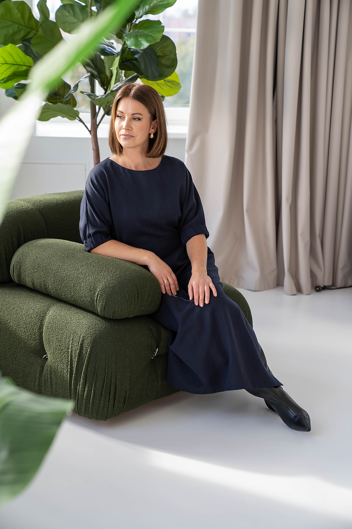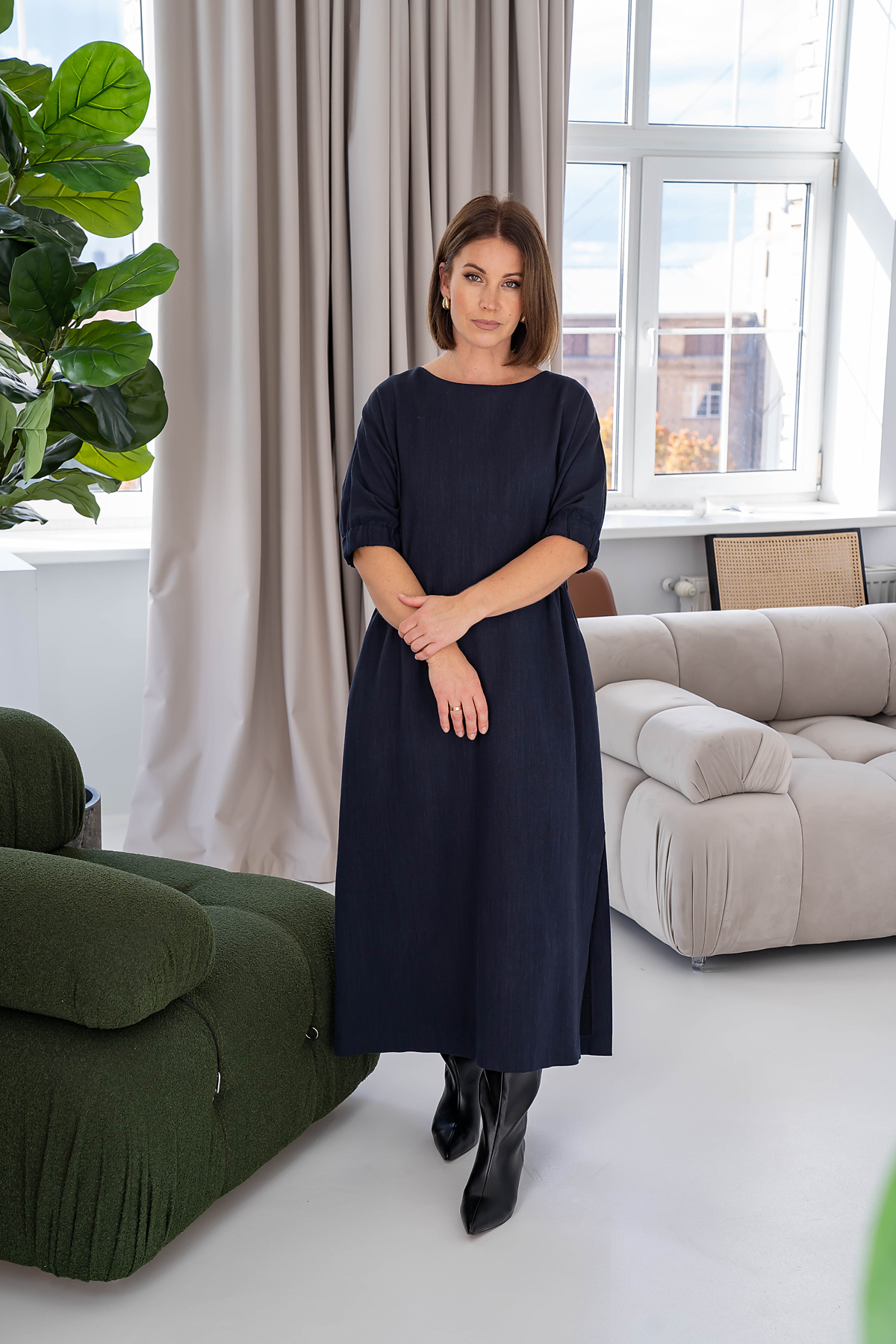 Apraksts: smalks vilnas audums (papildus elastāns 5%), audums ir elastīgs, kleitas sānos savilkumi, ar šķēlumu, midi garums, klasisks kakla izgriezums, pusgaras piedurknes.